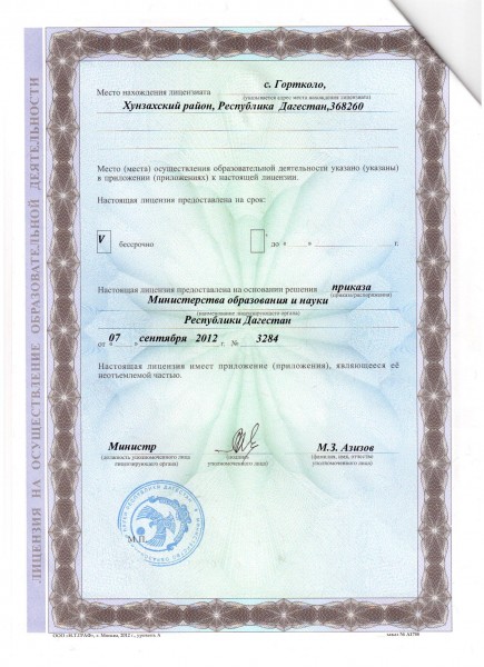 | Адрес местонахождения образовательной организации* | 368263, Республика Дагестан, Хунзахский район с. Гортколо |